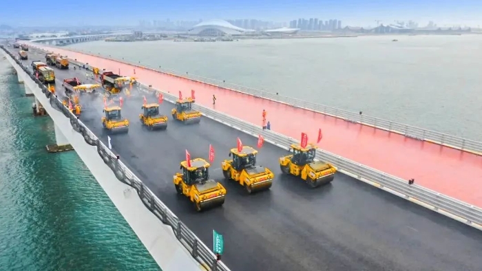 翔安大橋在建設中既要克服海上風浪大、潮差高、巖層強度高、跨越生態保護區等困難,又要兼顧綠色環保;要在這種復雜的環境中保證施工質量,對設備和施工技術的選擇就顯得尤為重要。徐工數字化智能施工集群憑借其智能化、高精度、高效率等顯著優勢,成功克服了傳統施工方式難以應對的諸多難題,可精準適配翔安大橋的橋面鋪裝工作。
