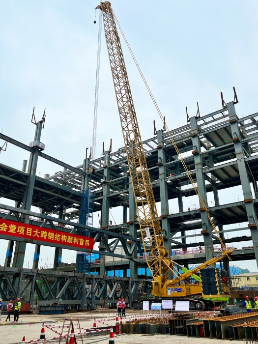 這里是西部(重慶)科學城鋼結構科學會堂工程現場,近日,該工程迎來了重要節點,在數雙目光的注視下,兩臺黃色身影仿佛“心有靈犀”,經過緊密配合,西南地區首例72米大跨度鋼桁架緩緩吊裝就位……