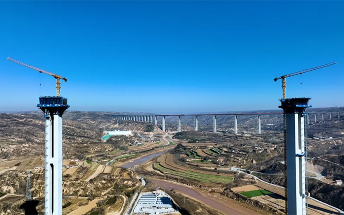 在廣袤的隴東地區,寒風凜冽,穿過層層大霧,俯瞰馬蓮河特大橋,似玉帶嵌入黃土高原,矗立河道旁的橋墩似根根“擎天柱”,徐工S1系列塔機正如火如荼加速建設,用奮斗的激情創造橋梁施工典范。