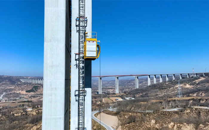 除了群塔助力,馬蓮河特大橋項目還使用了六臺徐工SC200/200FS1施工升降機,零停機、零故障,整機性能優越,應用新型高可靠傳動機構及高能效齒輪減速電機,實現平穩運行,保障鋼筋、水泥等建筑材料運輸安全,提高施工效率。