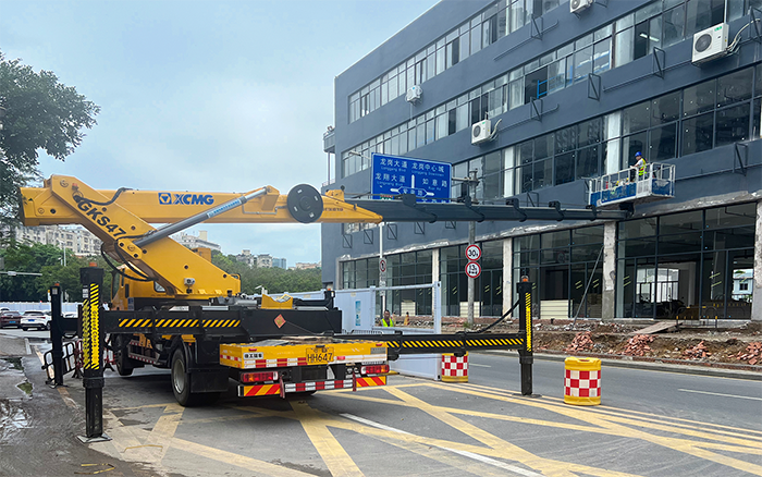 本次施工恰逢傍晚高峰期,時間緊、任務重,且水電路管道安裝需要長時間、高精準的持續性作業,對高空車性能要求較高。為避免占道施工阻礙交通,徐工GKS47高空作業車在街道對面的臨時停車區域快速展車,作業斗搭載3名施工人員和管路材料平穩伸出20余米,橫跨整條街道,直抵商鋪外立面的作業地點,憑借獨有的高精度比例閥驅動控制技術,實現微小流量的精準控制,使工作平臺毫米級的位置調節,便于工作平臺位置精調;柔性制動讓操作更加舒適,能夠精準識別操作員的操作意圖,制動體驗平穩、低沖擊、小晃動,以“微動性、安全性、高效率、大跨距”產品特點完美應對此次施工任務。