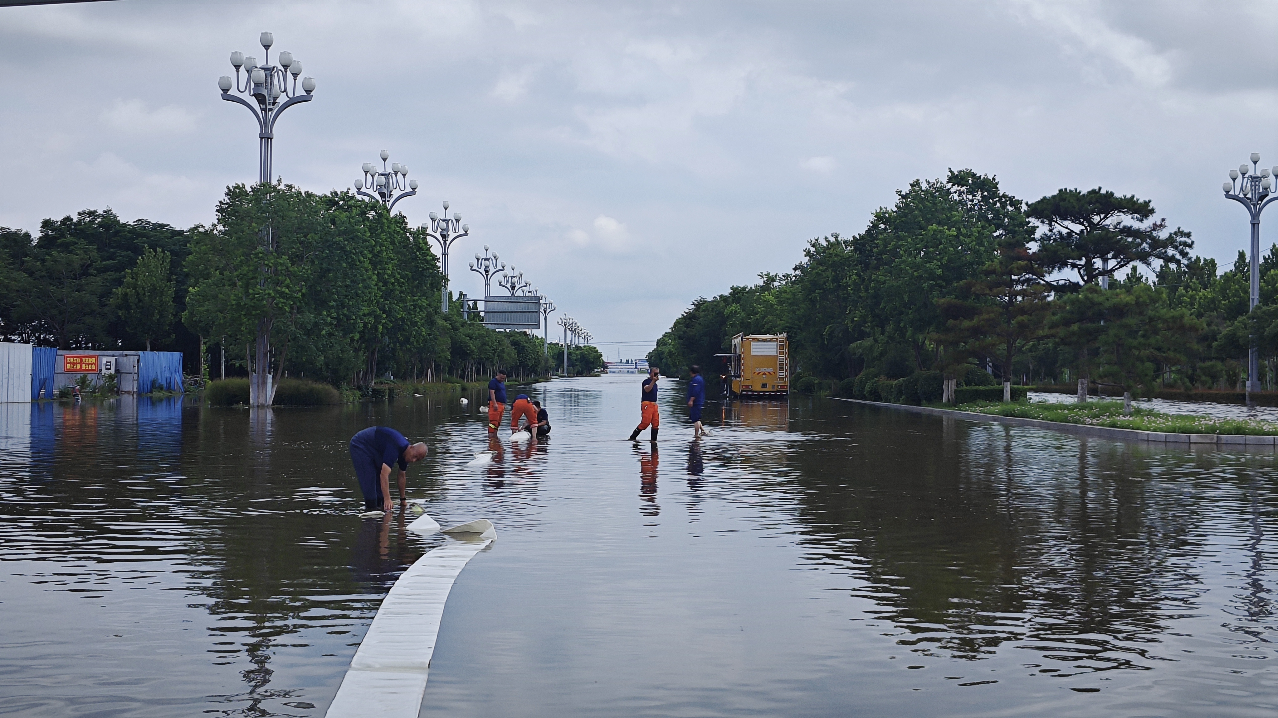 華商大道同屬商丘市睢陽區(qū),此處靠近河堤,周邊道路積水均向此處轉(zhuǎn)移,交通主干道被積水淹沒,影響城市正常通行。
