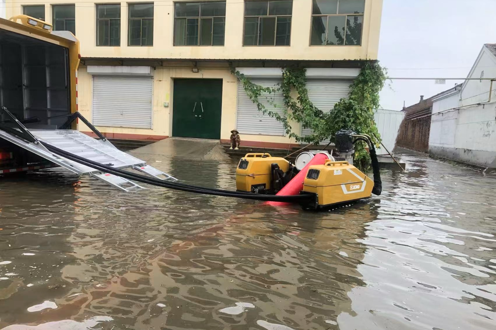 首日,車輛到達現場后,徐工救援人員立即針對現場環境制定排水方案。由于場地狹窄,大型救援車輛轉彎調頭不便,最終救援人員決定充分發揮“子母式排澇車”子車探入作業與履帶底盤小半徑轉彎優勢,將母車停至路口,遙控子車帶著120米水帶“穿街走巷 靈活走位”,將積水源源不斷排入下水道。連續作業6小時后,PS30F4累計排水超14000立方,因雨勢逐漸增大,第一天救援被迫中止。