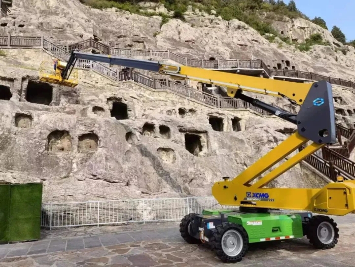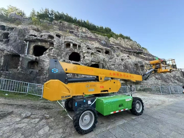 時間回溯到2021年,由于遭受多場暴雨侵襲,龍門石窟部分洞窟內滲漏水嚴重甚至出現積水,部分山體表面巖石脫落、松動,嚴重威脅文物安全,急需得到有效治理。龍門石窟研究院隨即開展了為期1年多的“龍門石窟蓮花洞至石牛溪區域保養維護項目”。徐工XGS25ACK-Li直臂式高空作業平臺作為“得力助手”,深度參與各項保護修復工作。