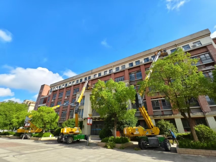此次施工通過(guò)使用徐工高空作業(yè)設(shè)備,有效避免了傳統(tǒng)腳手架對(duì)校園場(chǎng)地占用大、搭設(shè)周期長(zhǎng)的影響,體現(xiàn)了現(xiàn)代化施工設(shè)備在校園維修改造中的顯著優(yōu)勢(shì)。