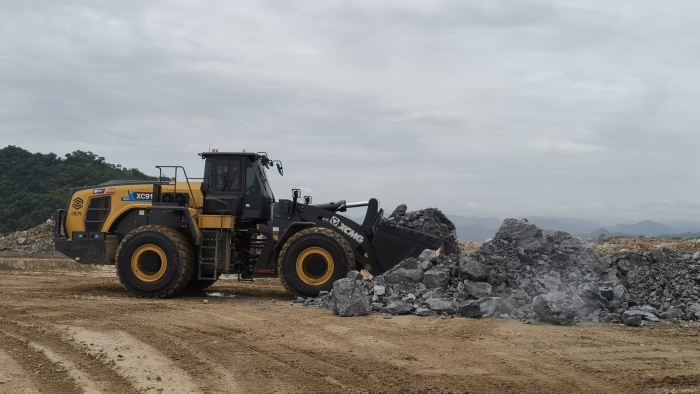 在東南亞某大型采石場,徐工XC9108-EV純電動裝載機正繁忙作業。這臺“鋼鐵巨獸”輕松鏟裝、轉運著沉重石料,成為這座采石場綠色轉型的核心力量。